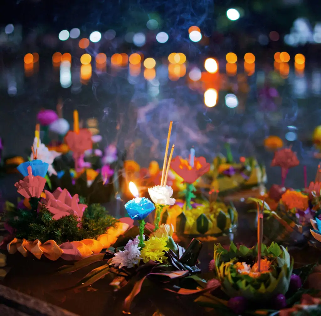 The name “Loy Krathong” literally means “to float a basket”: loy (ลอย) means “to float” and krathong (กระทง) is a small decorated raft or lotus-leaf vessel.